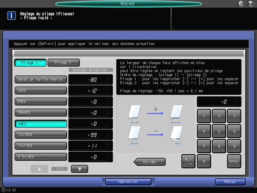Cette fonction permet de régler les positions du pliage roulé en spécifiant les valeurs souhaitées pour Pliage 1 et Pliage 2.