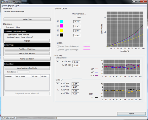 Vérifiez les résultats de mesure (densité CMJN et niveau de gris) sur l'écran [Calibration Manager].