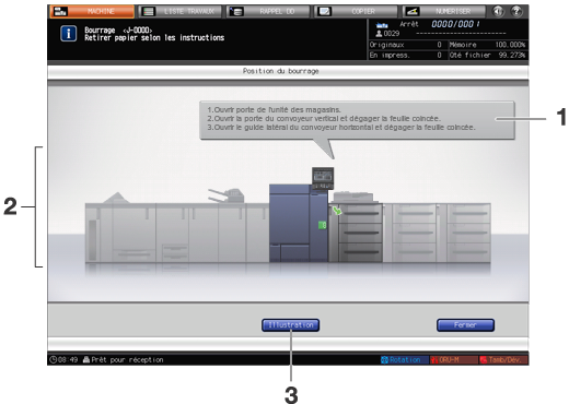 1 | Zone des messages | Des instructions détaillées concernant l'enlèvement du papier s'affiche. |
