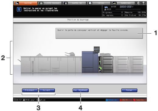 3 | [Suivant]/[Précédent] | Les touches sont affichées lorsqu'il y a plusieurs écrans [Description du procédé d'élimination bourrage]. Appuyez sur la touche pour afficher l'écran suivant ou l'écran précédent. |
