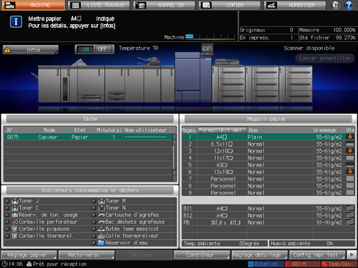 Quand le magasin utilisé pour un travail de copie se vide, l'impression s'arrête et le message [Mettre papier $########## indiqué / Pour les détails, appuyer sur [Infos]] s'affiche à l'écran.