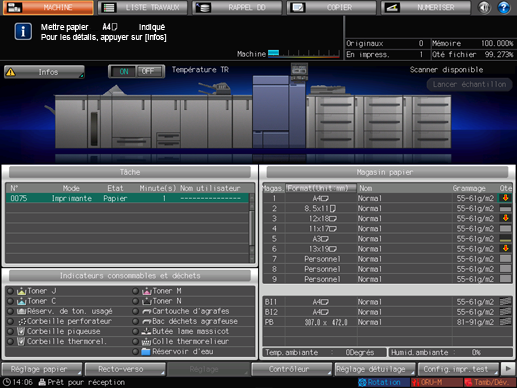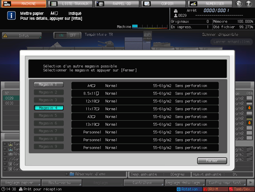 Lorsque le magasin utilisé pour une tâche d'impression commandée depuis un ordinateur est vide, l'impression s'arrête et le message [Remettre du papier $####### dans le magasin $ / Pour confirmer les détails, pressez [Infos]] s'affiche à l'écran.