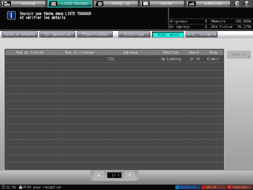 Lorsque l'indication [Erreur] s'affiche dans [Hist. envoi] sous l'onglet [LISTE TRAVAUX] et que des données de numérisation n'arrivent pas à destination, voir les pages suivantes.