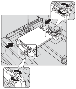 Déplacez les bords supérieurs des plaques-guide latérales pour aligner les guides sur le papier, puis tournez les deux boutons de fixation des guides latéraux dans le sens horaire pour fixer les guides.