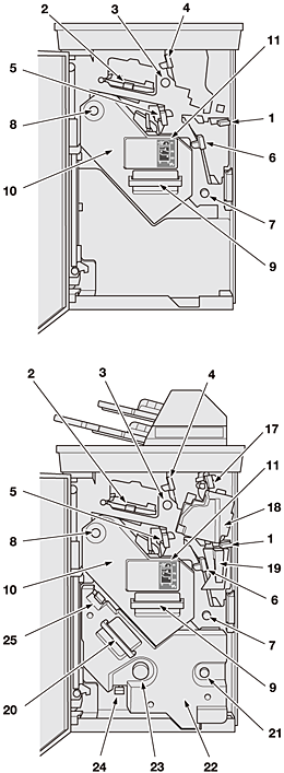 25 | Levier [SD7] | Ouverture vers le haut pour l'élimination de bourrage papier après avoir sorti la piqueuse à cheval. |