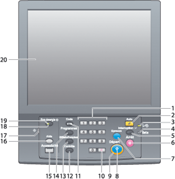 5 | Interruption | Suspend l'opération de copie/d'impression/de numérisation en cours pour permettre la réalisation d'un travail simple de copie. Ne fonctionne que sur la machine équipée de l'Unité d'alimentation papier PF-708. |