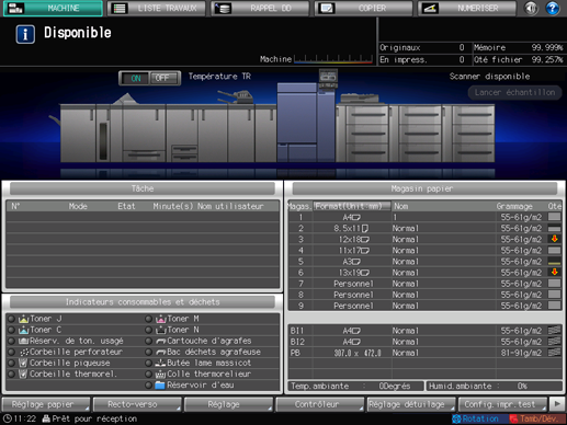 Les boutons [MACHINE], [LISTE TRAVAUX], [RAPPEL DD], [COPIER] et [NUMERISER] figurent en haut de l'écran tactile. La sélection d'un bouton affiche l'écran d'utilisation des fonctions correspondant au nom du bouton. La sélection de Utilitaire/Compteur sur le panneau de contrôle affiche l'écran [UTILITAIRE] sur lequel vous pouvez définir divers paramètres machine.