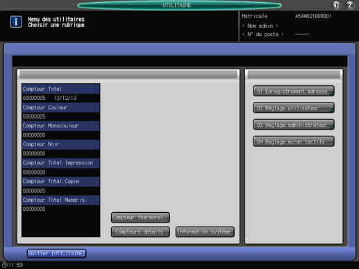 Appuyez sur le bouton Utilitaire/Compteur du panneau de contrôle pour afficher l'écran [UTILITAIRE]. L'écran [UTILITAIRE] permet de définir plusieurs paramètres machine.