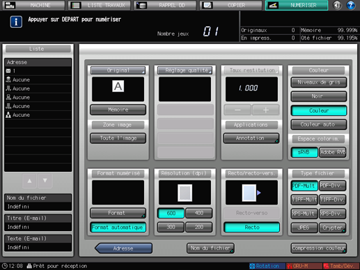 Les écrans de la fonction de numérisation englobent l'écran de sélection des adresses et l'écran de configuration des réglages de numérisation.