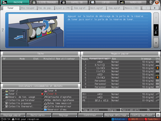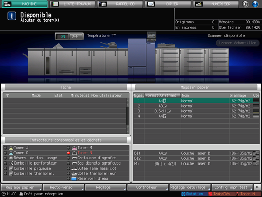 L'indicateur de couleur toner à réapprovisionner s'allume en rouge dans la zone [Indicateurs consommables et déchets] de l'écran [MACHINE].