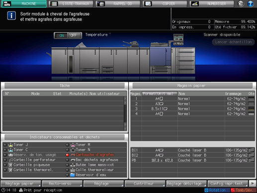 L'indicateur de cartouche d'agrafes s'allume en rouge dans la zone [Indicateurs consommables et déchets] de l'écran [MACHINE].