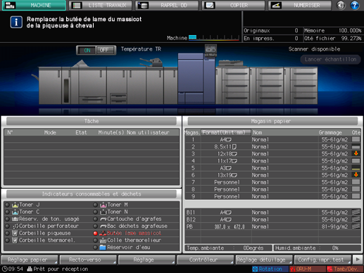 L'indicateur Butée de lame du massicot de la piqueuse à cheval s'allume en rouge dans la zone [Indicateurs consommables et déchets] de l'écran [MACHINE].