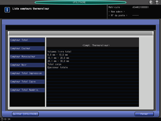Lorsque la machine est dotée du thermorelieur PB-503, [Compteur thermorel.] apparaît sur l'écran du menu Utilitaire. La sélection de cette touche affiche le [Compt. Thermorelieur]. Une fois la vérification terminée, appuyez sur [Fermer].