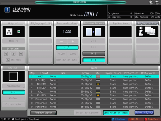 Sélectionnez Recto/Recto-verso, Réglage sortie, Magasin et Réglage papier, puis appuyez sur le bouton Départ du panneau de contrôle.