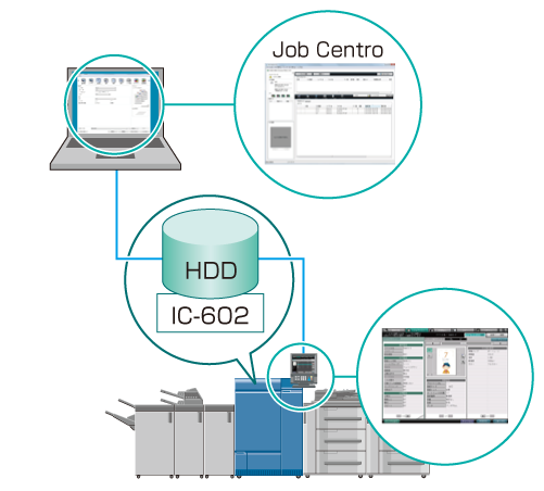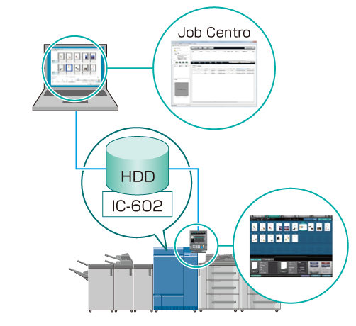 L'impression et la modification des tâches peuvent être commandées sur l'écran tactile de la machine ou sur un ordinateur sur lequel est installé Job Centro.