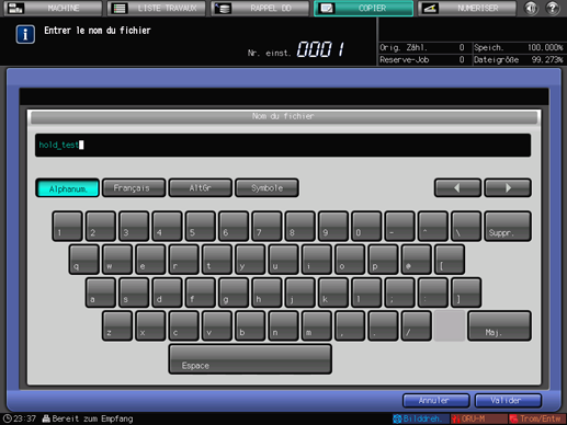 Entrez un nom de fichier (64 caractères à un octet) et appuyez sur [Valider].