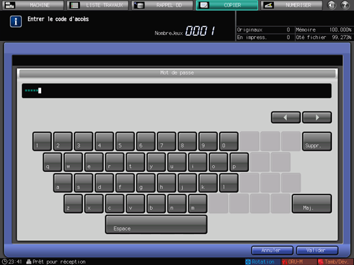 Entrez le mot de passe (8 caractères alphanumériques à un octet max.) et appuyez sur [Valider].