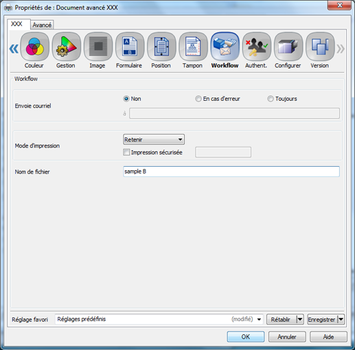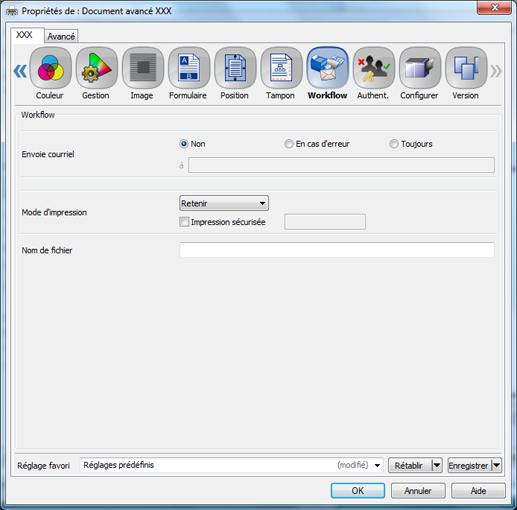 Cliquez sur l'onglet [Workflow] et sélectionnez [Retenir] (ou [Imprimer/Retenir]) dans [Mode d'impression].