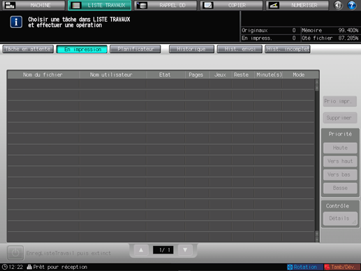 Sur l'écran tactile de l'imprimante, appuyez sur [LISTE TRAVAUX].