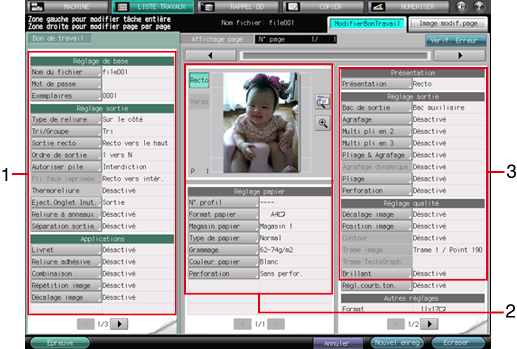 2. Volet central de l'écran | Affichage image d'aperçu | Affiche l'image d'aperçu du fichier sélectionné. Vous pouvez afficher un aperçu de l'image recto et verso d'un original 2 faces et vérifier l'image de rotation page ou le sens de sortie de l'image. Sur l'écran de prévisualisation, vous pouvez définir les repères cadrage, la position d'image ou la fonction Décalage d'image. |
