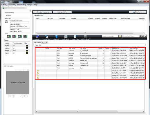 Dans Job Centro, vous ne pouvez modifier que les tâches d'impression ([Type Tâche] = [Imprimer]). Pour modifier des tâches de copie ([Type Tâche] = [Copier]), utilisez l'écran tactile de l'imprimante.