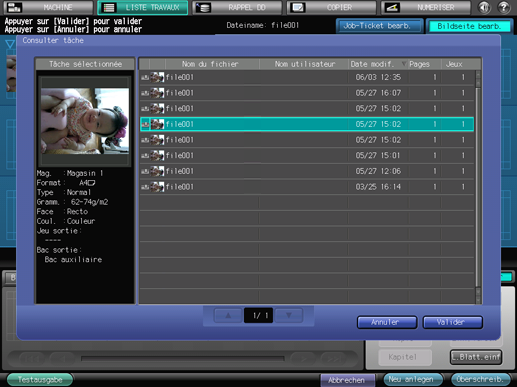 Sur l'écran tactile de l'imprimante, appuyez sur [LISTE TRAVAUX].