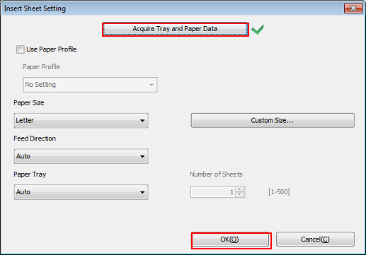 Si vous cliquez sur [Acquérir données du magasin et du papier], les données magasin et papier sont acquises et une coche verte est ajoutée.