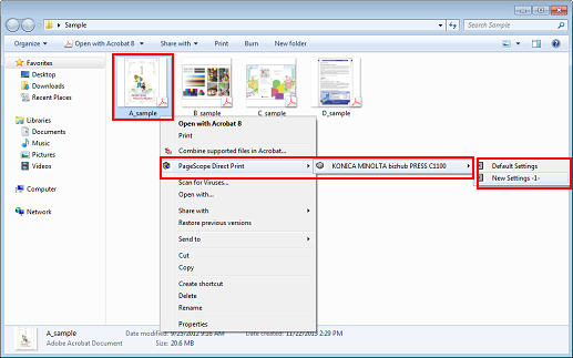 Faites un clic droit sur le fichier à imprimer, sélectionnez [PageScope Direct Print] dans le menu et sélectionnez le paramètre d'imprimante et de tâche.