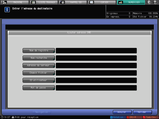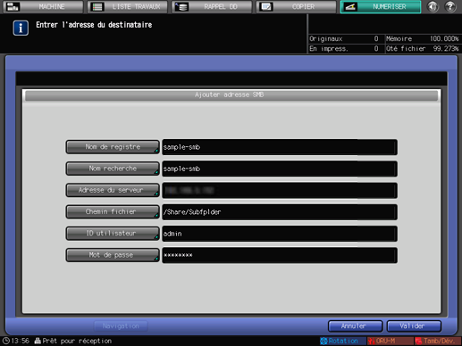 Enregistrez le serveur SMB de destination sur la machine à l'aide de l'écran tactile de l'imprimante.