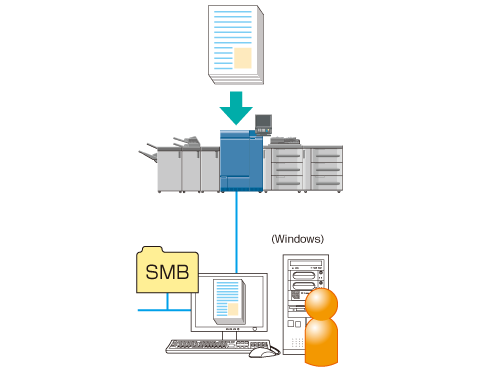 Vous pouvez envoyer un gros volume de données numérisées sur la machine au dossier partagé créé sur l'ordinateur Windows (prise en charge du protocole SMB) sur le réseau.