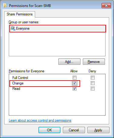 Sélectionnez les noms de groupes/d'utilisateurs à qui donner l'autorisation d'accès et cochez l'option [Modifier] de [Autoriser]. Cliquez sur [OK].