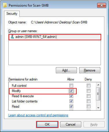 Sélectionnez le nom d'utilisateur entré à l'étape 9 et cochez l'option [Modifier] de [Autoriser]. Cliquez sur [OK].