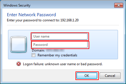 Entrez [Nom d'utilisateur] et [Mot de passe] définis pour le Dossier actif et cliquez ensuite sur [OK].