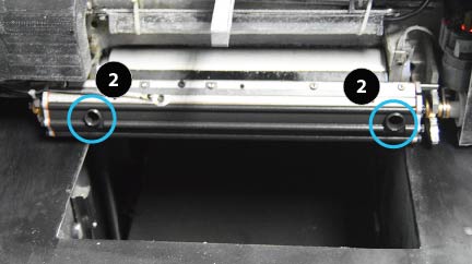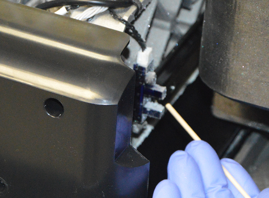 Station de maintenance de la tête (HMS) : la station de maintenance de la tête nettoie la tête d'impression en permettant d'effectuer une purge dans le bac à déchets et d'essuyer la tête d'impression afin d'enlever tout matériau restant.