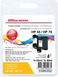 Cartouches jet d'encre Office Depot Compatible pour HP 45 + 78 Noir et 3 Couleurs SA308AE Cartouches jet d'encre Office Depot Compatible pour HP 45 + 78 Noir et 3 Couleurs SA308AE QUALITE : Les cartouches Office Depot ont été démontées nettoyées remplies et contrà´lées.Ainsi nous vous fournissons des produits qui correspondent aux exigences de qualité et durée de vie. GARANTIE : Nous sommes certains de la qualité de nos cartouches. Elles sont garanties sans défauts de matériel comme de fabrication (en condition classique d'utilisation). Bénéficiez de la qualité d'impression avec les cartouches Office Depot qui sont le choix idéal pour économiser ainsi que protéger l'environnement. DesignJet 700 750C 750C Plus 755CM. DeskJet 710c 720c 815c 820cxi 825cxi 830 832c 870cxi 880c 895cxi 930c 950c 959c 960c 970cxi 980cxi 990cm 990cxi 995c 1000c 1100c 1125c 1180c 1220c 1280 1600c 1600cm 6122 9300. Fax 1220 Officejet G85 K80 Pro 1150C Pro 1170C/1175C T series R series. Photosmart 1000 1115 1215 1218 1315 P1100 Cartouches & Toners > Cartouches jet d'encre > Cartouches jet d'encre imprimantes et multifonctions > Cartouches jet d'encre imprimantes et multifonctions